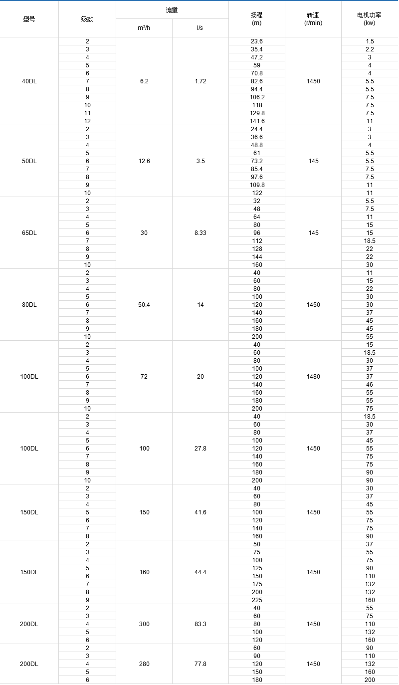 DL、DLR型泵系立式單吸多級分段式離心泵,供輸送不含固體顆粒的清水及物理化學性質(zhì)類似于水的液體之用。主要用于高層建筑供水,也可應用于廠礦給排水、輸送液體的流量范圍為6.2~280m3/h,揚程范圍為18.5~225m,配套功率范圍為1.5~200kw,口徑范圍為Ф40~Ф200mm。 DL、DLR型系列泵適用于工業(yè)和城市給排水、高層建筑增壓送水、消防增壓、遠距離送水、采暖、浴室、鍋爐冷暖水循環(huán)增壓、空調(diào)制冷系統(tǒng)送水及設備配套等場合。DL型介質(zhì)使用溫度不超過80℃,DLR型介質(zhì)使用溫度不超過120℃。